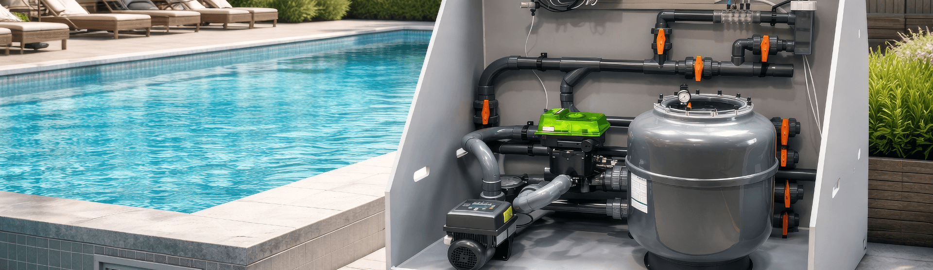 Filtrs, filtrācijas sūknis un Besgo automātiskais filtra pret-skalošnas vārsts komplektā ar Senco kompresoru un Oxilife ūdens dezinfekcijas staciju, ir iepriekš samontēti un uzstādīti speciālā Tehnoloģiju kastē (elektrība nav iekļauta). Ir ņemta vērā arī siltumsūkņa, ūdens līmeņa kontroles un zemūdens prožektoru integrācija (pēc izvēles).